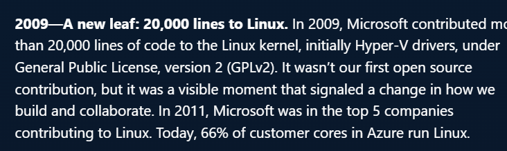 A headline caught my eye recently, one in a long series of similar pieces from Microsoft: a celebratory look back at their 2009 contribution of 20,000 lines of code to the Linux kernel. The narrative is one of a new leaf, a turning point, a company evolving from a closed-source fortress into a collaborative open-source neighbor.