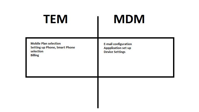 TEM stands for telecom expense management, this is the process in which you provision the phone. This is when you set up data, voice, make a phone selection (Android/BlackBerry/IPhone etc:) Now some companies can handle this entire process, you basically let them pay the bill for you, and they will handle the entire procurement for you. But that is when MDM ( in the traditional sense) begins. MDM manages the user experience when they have the phone. It is responsible for helping the user set up e-mail, get applications, set up security policies and monitor the device. The advantage to having someone to both TEM and MDM is they can manage the entire life-cycle. Customers are going to want someone who can make the entire point to point solution, they don’t want to have to deal with TEM people, or MDM people, they want to deal with mobility people. I think once we figure out that piece of the puzzle, one company who can truly do it both, they will own the entire market. Although some companies do this now, they are not known enough for it, and they do not do it on a constant enough basis.